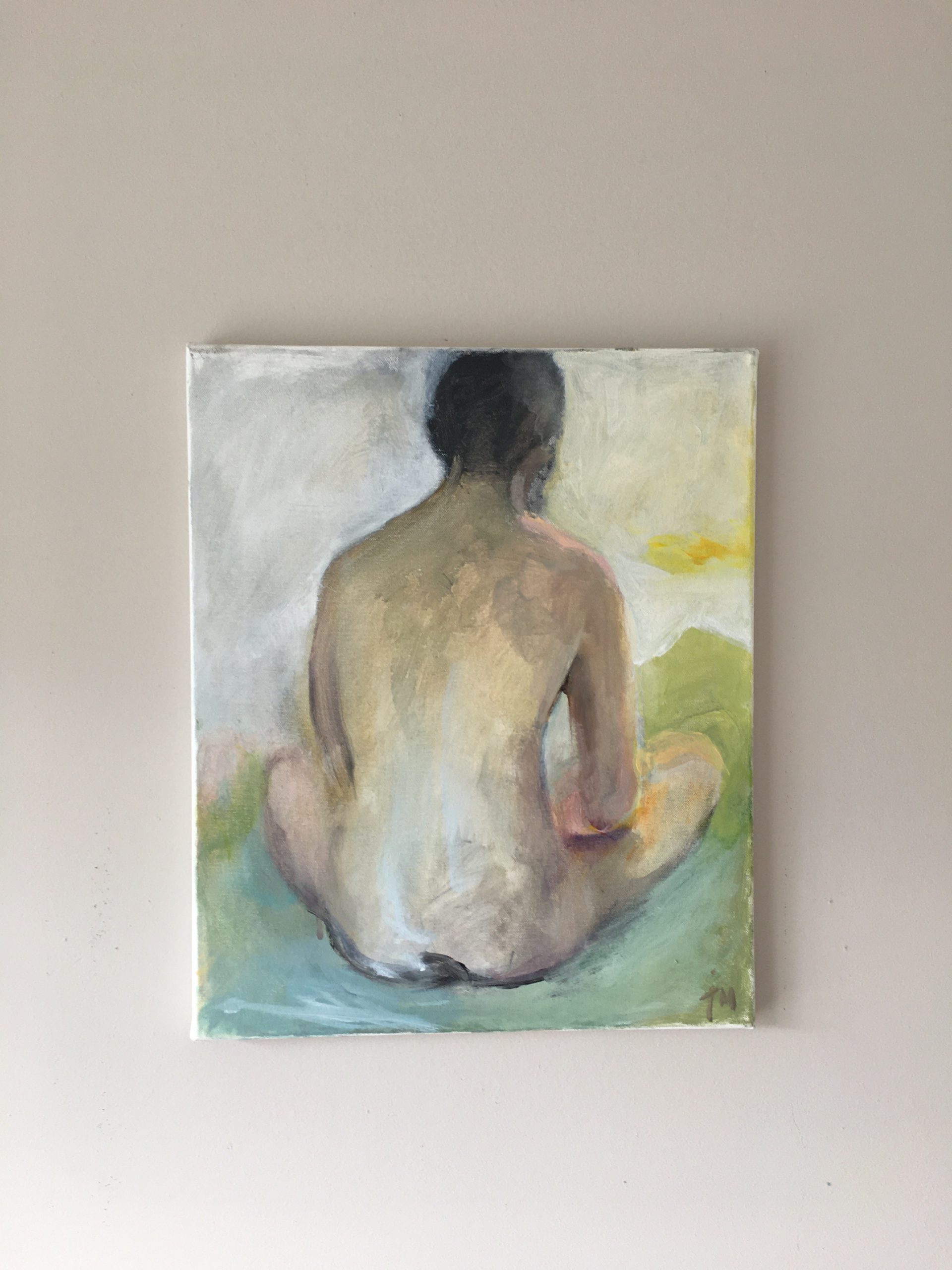 Akryylimaalaus kankaalle elävästä mallista. Koko noin 38×45 cm.